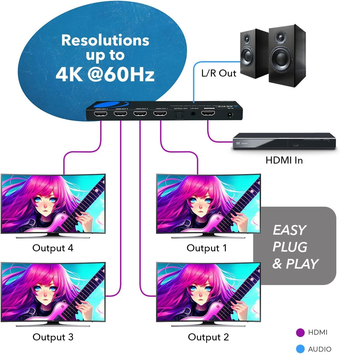 OREI 1x4 2.0 HDMI Splitter with Scaler Audio Extractor 4 Ports with Full Ultra HDCP 2.4K at 60Hz & 3D Supports EDID Control - UHDS-104A—